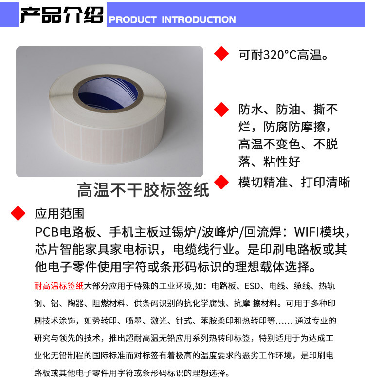 耐高溫標簽材料以聚酰亞胺薄膜為基材,涂以進口耐高溫有機硅壓敏膠而成。膠帶具有極好的耐高溫性,電絕緣性,抗化學性,且無毒、無異味、對人體及環(huán)境無害。由于具有極低的離型剝離力(可自動模切、排廢、貼標),適用于PCB、鋼材、鋁材等高溫場合下的可識別跟蹤標簽;并可制成各種高溫標簽,使用起來十分方便,是近年發(fā)展起來的新型標簽品種。